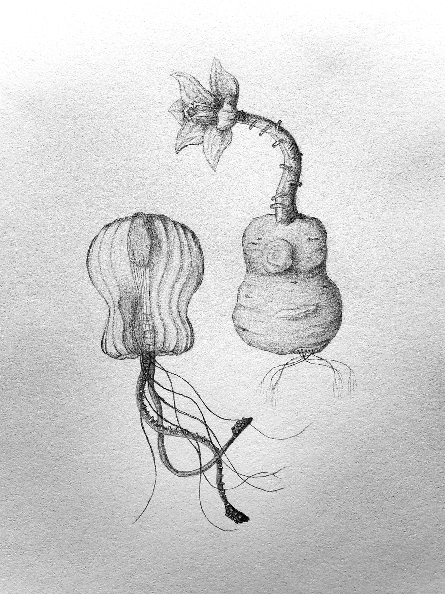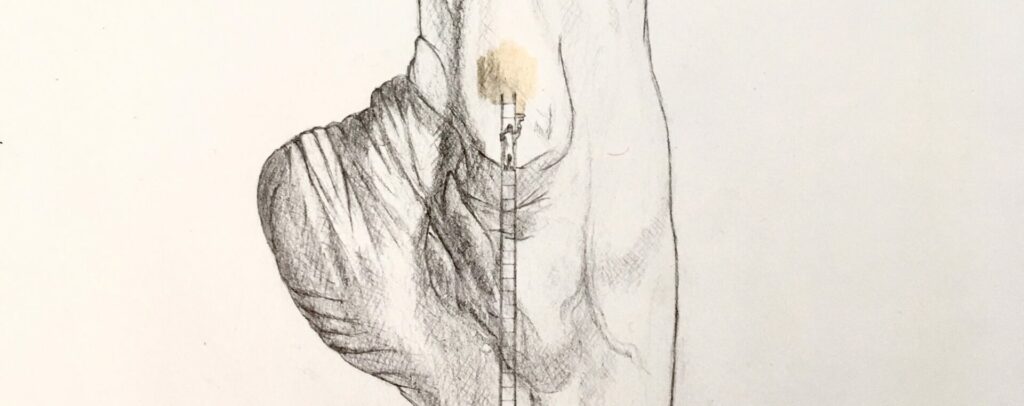 Das analoge Gestalten führt zu wiederholtem Betrachten von Objekten, die abgebildet werden sollen. Ob Komplexes Instrument oder banale Frucht. Welche Eigenheiten einer Melone lässt uns diese auf einer Kritzelei erkennen?